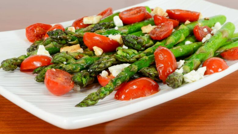 3. Në një tas të madh përzieni shpargjet, domatet, djathin dhe majdanozin/borzilokun.